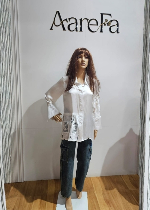 The fluid silhouette and breathable fabric make it ideal for all-day wear, while the subtle embroidery elevates it from a basic essential to a refined statement piece. Pair it effortlessly with denims, trousers, or skirts for a chic, contemporary look.