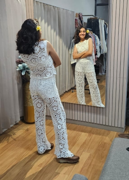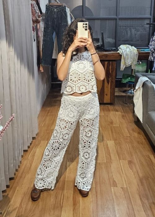 Step into effortless bohemian elegance with this Ivory Boho Style Top & Pant Set. Crafted in an intricate crochet-inspired pattern, this co-ord set blends free-spirited charm with modern comfort.
