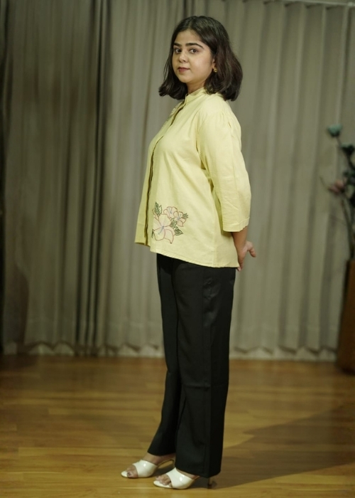 Designed with a classic front-button silhouette and three-quarter sleeves, it offers an easy, flattering fit suitable for everyday wear. The soothing pastel yellow tone adds a fresh, cheerful charm, making it perfect for workwear, casual outings, or relaxed daytime styling.
