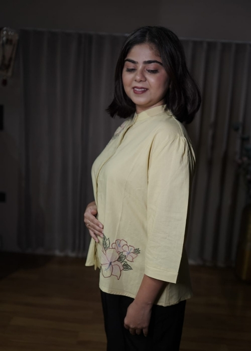 The Lemon Bloom Cotton Embroidered Top is a refreshing blend of comfort, simplicity, and subtle craftsmanship. Made from soft, breathable cotton, this top features delicate floral embroidery placed thoughtfully to create a balanced and elegant look.