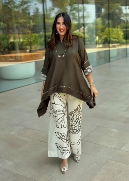 Paired with printed palazzo pants in contrasting neutral shades, the silhouette offers graceful movement and a flattering drape. Designed for versatility, this set transitions seamlessly from daytime outings to evening gatherings, making it a stylish choice for modern wardrobes.