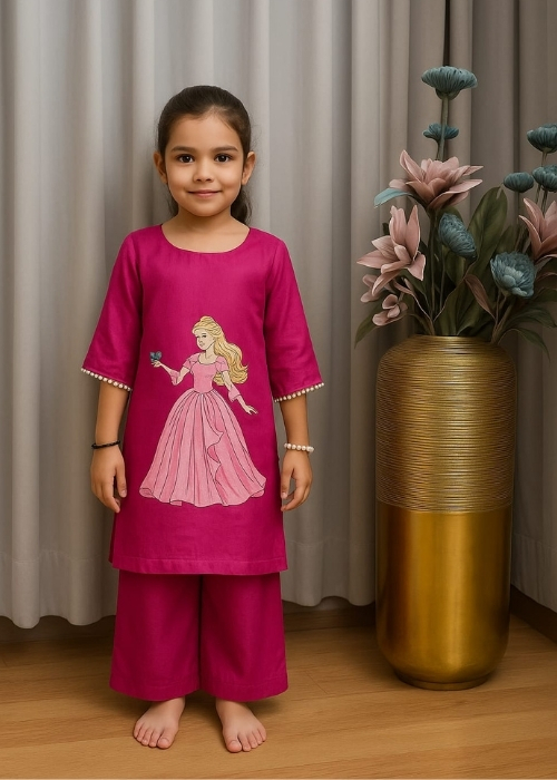 The Princess Aura Hand-Painted Rani Pink Dress Set is a charming blend of comfort, creativity, and playful elegance. Crafted in a rich rani pink shade, this outfit features an adorable hand-painted princess artwork that adds a magical touch little ones will love.