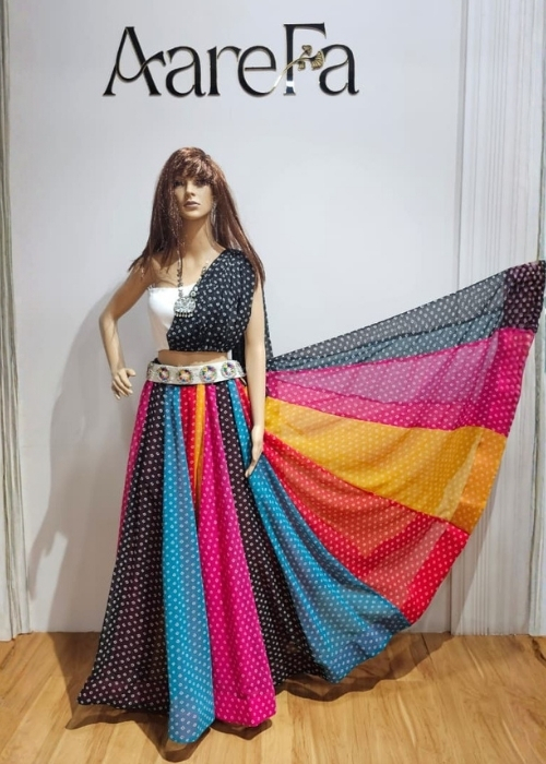 Crafted from lightweight chiffon, the lehenga features a beautiful mix of bold and soft colours arranged in striking panels, enhanced with delicate dotted detailing. The airy fabric ensures effortless drape and comfort, making it perfect for twirls, festive celebrations, and statement occasions.